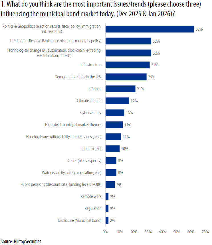 “Politics & Geopolitics” (62%) was cited as the most important issue or trend influencing the municipal bond market right now, based on our survey conducted in Dec. 2025 and Jan. 2026. Last year “Politics” (40%) ranked as the second most important issue or trend influencing the municipal bond market, just behind “Infrastructure” (44%). Public pensions used to be analysts’ top concern year after year. In 2025, only 7% named it as a top issue, down from 17% in 2024.
