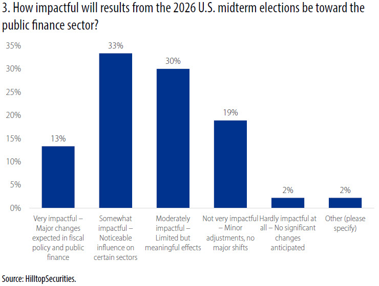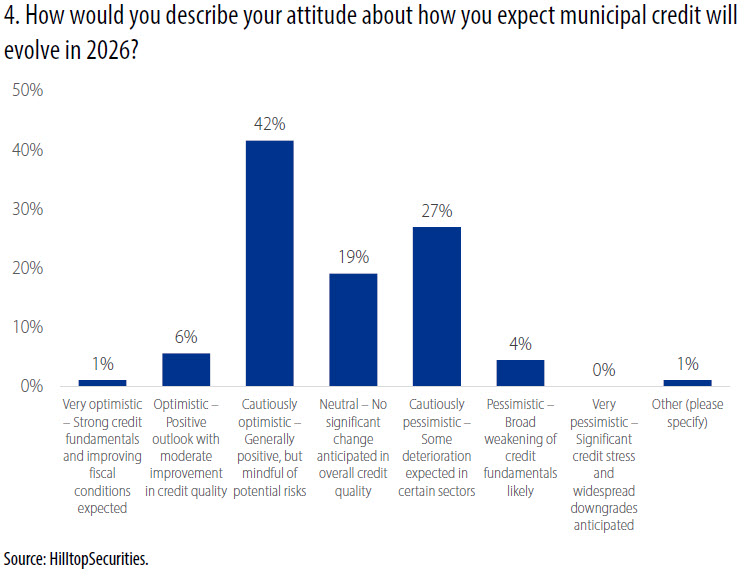 The results are based on a survey conducted by HilltopSecurities in December 2025 & January 2026. The above data was collected from 90 municipal bond credit analysts/ specialists. Analysts from the rating agencies were not asked to participate in the survey.