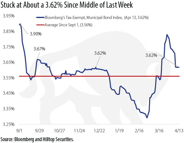 The more important opportunity, amidst all the obstacles like monetary policy, the macro-economic environment, fiscal policy, geopolitics and municipal credit is the level of absolute yields we are seeing in mid-April. We got a second look at last year’s yields a few weeks ago. This market is still offering investors an excellent entry point. The Bloomberg Municipal Bond Index’s yield has been hovering around a 3.62% since the middle of last week. It was as high as a 3.83% at the end of March. The 10-year Municipal Market Data (MMD) AAA benchmark yield ended Monday at a 2.95% yield.