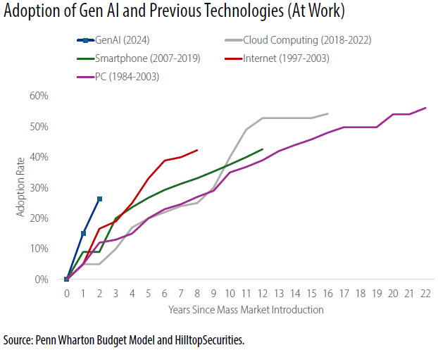 GenAI adoption at work has been fast and real, but the early curve still looks more like the spread of other important technologies rather than a clean break from history, according to The Projected Impact of Generative AI on Future Productivity Growth by the Penn Wharton Budget Model. The usage data says AI adoption is rising, experimentation is broadening, and workflow integration is underway. The market is increasingly assuming that AI may eventually go deeper than prior tools into white-collar work, reach closer to cognition itself, and force firms to redesign not only tasks but headcount, management, and business architecture. Both ideas can be true at the same time. A general-purpose technology can be transformative over time without immediately producing a dramatic macroeconomic signature.