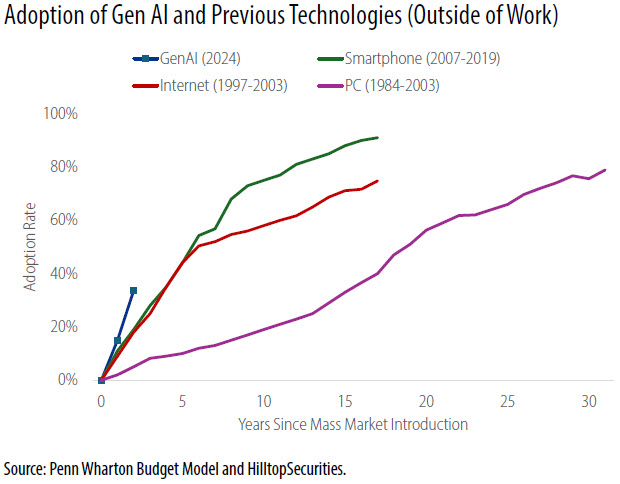 That gap between perception and evidence is not a contradiction. It is a marker of where we are in the tech transition. Capability is growing quickly. Yet adoption, while also occurring quickly compared to past technologies, is probably lagging outside of the technology world as leaders, workers, and the economy still consider and absorb the potential for change.