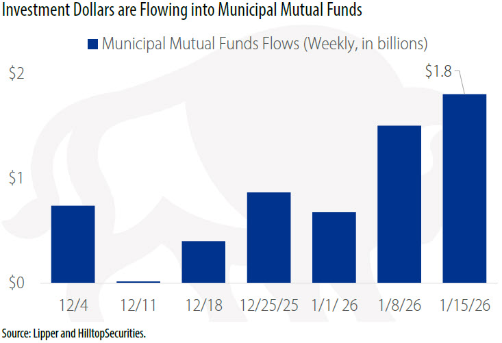 This is what we are seeing now. The risk tone remains steady, the Fed meets Jan. 27–28 with no change expected after three 2025 cuts, and the path for 2026 still leans lower. January’s investment flows into municipal mutual funds strengthened while supply stayed light, and municipal yields are about 15 basis points lower year to date after breaking below the fall 2025 range. That mix is doing real work for buyers, which is why our message remains simple: stay engaged, average in for core tax‑exempt income, focus on quality in this environment, set your targets ahead of time and execute when they’re offered or available.